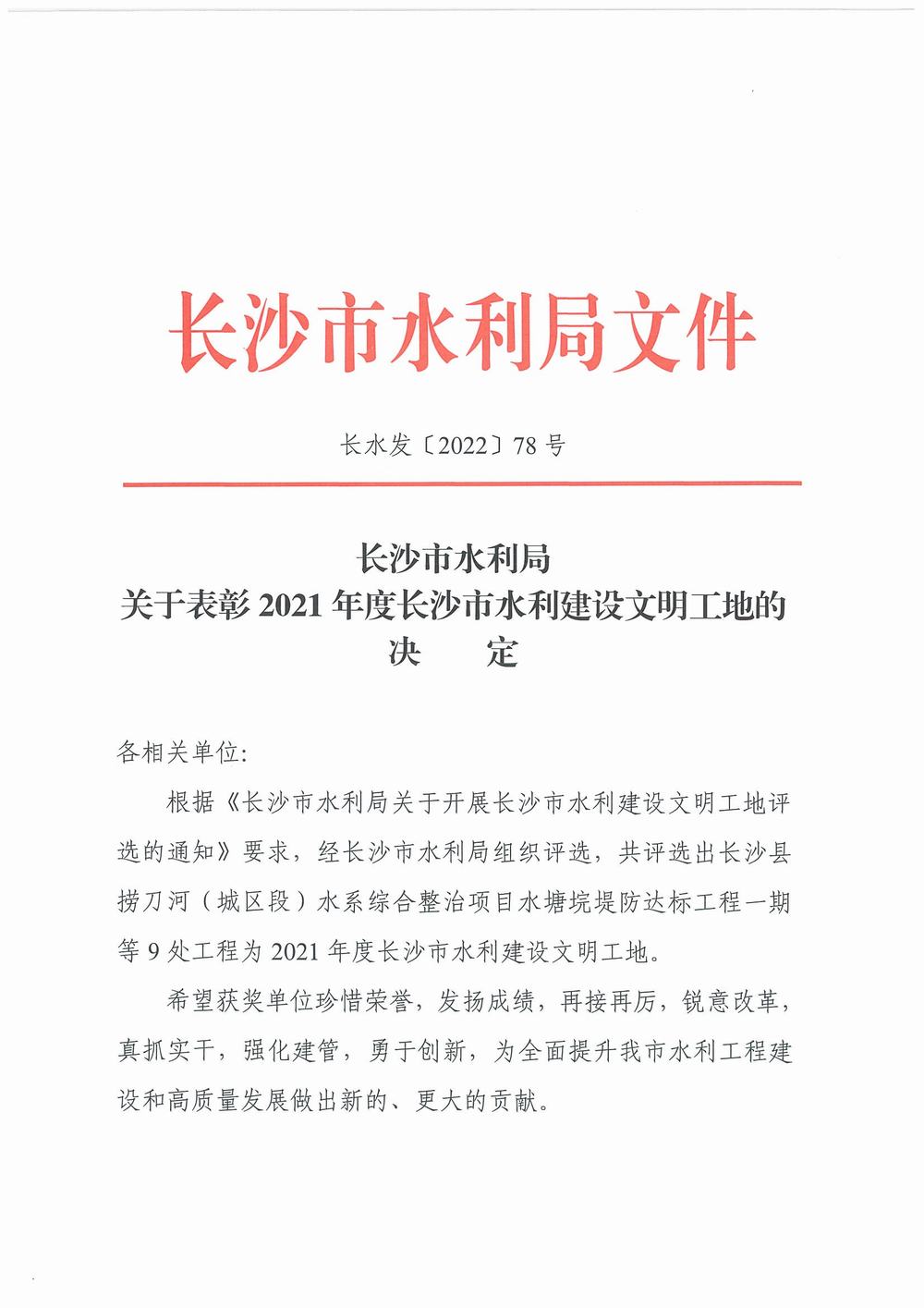 关于表彰2021年度长沙市水利建设文明工地的决定.pdf