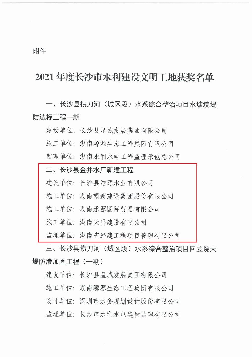 2021年度长沙市水利建设文明工地(金井水厂、万年桥)